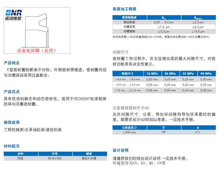 Y型密封圈的截面呈Y形,是一种典型的唇形密封圈。广泛应用于往复动密封装置中,其使用寿命高于O型密封圈。Y型密封圈的适用,工作压力不大于40MPa,工作温度为-30~80℃。