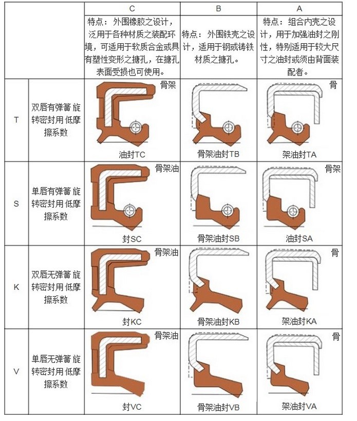 按结构形式可分单唇骨架油封和双唇骨架油封。双唇骨架油封的副唇起防尘作用,防止外界的灰尘,杂质等进入机器内部。按骨架型式可分为内包骨架油封,外露骨架油封和装配式油封。
