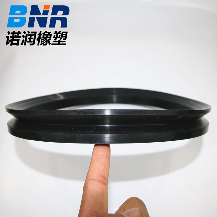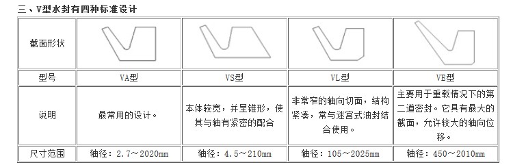 一、V形水封的特点及优点 形水封依靠其自身弹性张力固定在轴上,扰性的密封唇用一较小的接触力和轴座表面保持接触。 挠性的密封唇可对轴的偏心,腔体与轴的不同轴度及轴的加工误差进行补偿。 密封唇可防止内部油脂或油液向外泄露,同时防止外部的灰尘、脏物等侵入。由于V形水封随轴进行旋转运动,由于离心力的作用,其本体的作用好似滑环一样,防止污物侵入工作介质。 与其它油封不同是,V形水封依靠其弹性的密封唇形成径向密封作用。密封唇具有良好的活动性和适应性,所以相对于其它密封件需要较小的公差配合,简单的设计,同时弥补旋转轴偏心的问题。 因此其具有以下优点: -不含金属件的纯橡胶弹性体材料; -减轻了设计方面的工作,没有安装加工方面的要求; -取消了轴配合表面加工和表面精度、硬度的要求,轴表面不必淬硬; -安装及拆卸简单、可靠; -表面接触压力小,因此磨擦力小,磨擦损失及磨擦发热少,使用寿命长; -兼有密封和防尘作用。