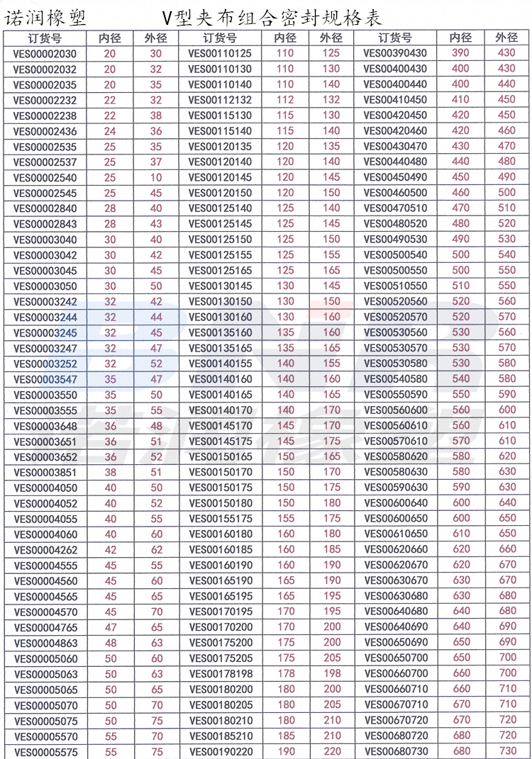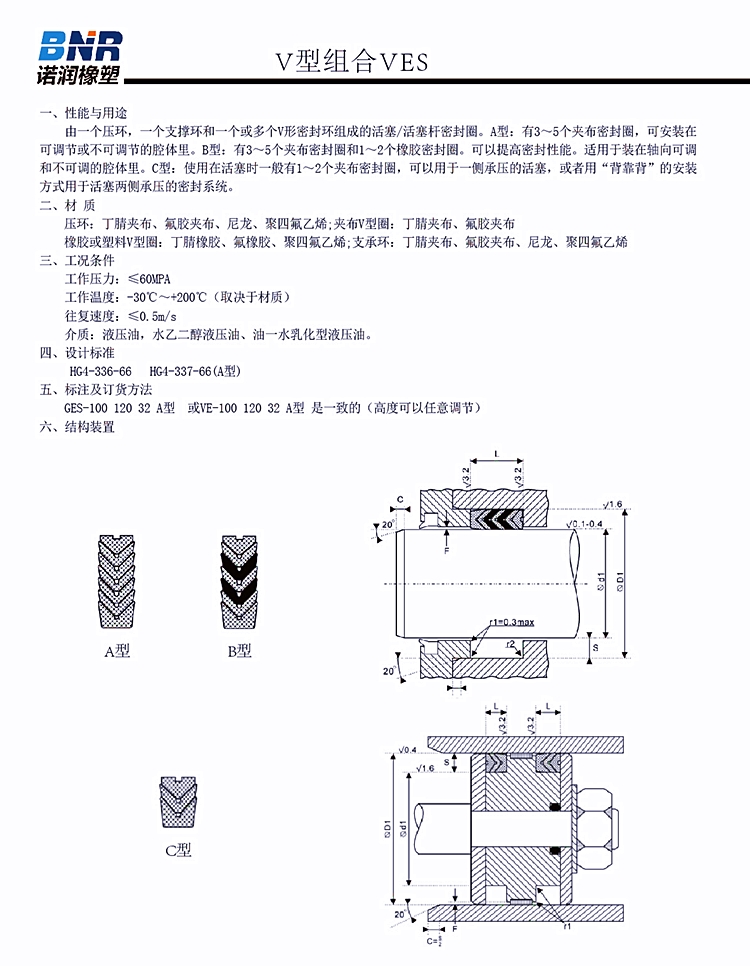 V型组合密封用于密封活塞杆的多重密封圈组,由一个压环,一个支撑环,以及至少三个V形密封环组成。A型:有3~5个夹布密封圈,可安装在可调节或不可调节的密封区。B型:有3~5个夹布密封圈。一个橡胶弹簧,安装在不可调节的密封区,恒定的轴向预紧力。C型:有2~4个夹布密封圈。一个橡胶V形圈,可安装在可调节或不可调节的密封区。GES型适用于注塑机、平板硫化机、炼钢机械等中的活塞杆密封。