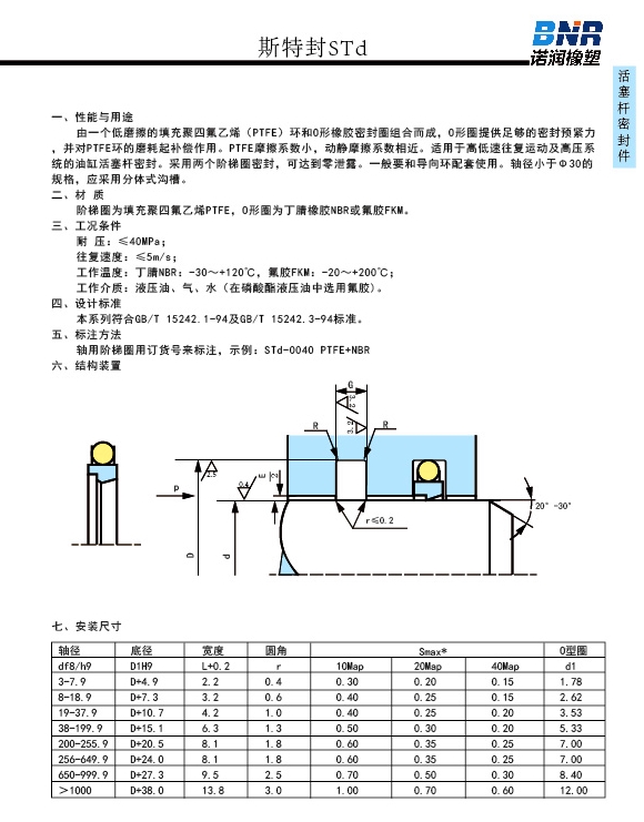 一、性能与用途 由一个低磨擦的填充聚四氟乙烯(PTFE)环和O形橡胶密封圈组合而成,O形圈提供足够的密封预紧力,并对PTFE环的磨耗起补偿作用。PTFE摩擦系数小,动静摩擦系数相近。适用于高低速往复运动及高压系统的油缸活塞杆密封。采用两个阶梯圈密封,可达到零泄露。一般要和导向环配套使用。轴径小于Φ30的规格,应采用分体式沟槽。 二、材 质 阶梯圈为填充聚四氟乙烯PTFE,O形圈为丁腈橡胶NBR或氟胶FKM。 三、工况条件 耐 压:0-40MPa; 往复速度:≤5m/s; 工作温度:丁晴NBR:-30~+120℃,氟胶FKM:-20~+200℃; 工作介质:液压油、气、水(在磷酸酯液压油中选用氟胶)。 四、设计标准 本系列符合GB/T 15242.1-94及GB/T 15242.3-94标准。可参考Parker公司OD系列、Merkel公司-OMS-MR及霞板公司S55013系列。 五、标注方法 轴用阶梯圈用订货号来标注,示例:STd-0040 PTFE+NBR 六、结构装置